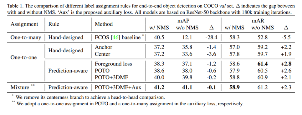해당 논문의 프레임워크는 FCOS와 흡사하기 때문에 이를 베이스라인으로삼고 비교실험을 한 결과입니다. 기존에 NMS를 사용하는 FCOS와는 달리 one-to-one label assignment, 3D max pooling, aux loss를 이용하여 nms를 제거하였고, 이 3가지가 모두 포함되었을때, coco데이터셋에서 FCOS보다 더 좋은 성능이 나왔습니다. 이는 곧 nms를 사용하지 않고도 비슷하거나 더 좋은 성능을 낼 수 있다는 소리입니다.