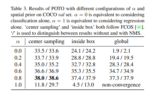 그밖의 ablation study에서 참고하는 regression과 classification의 비중에 따른 spatial prior의 성능에 대한 분석입니다. 해당 논문에서는 reg와 cls의 quality에 따라서 one-to-one label을 assign하였기 때문에 그 quality를 보는 비중을 다르게하는 알파값의 차이에 대한 분석을 한것이고 0.8 일때, 가장 높았습니다. 그리고 해당 결과에서 center sampling을 하는 이유는 베이스라인으로 사용한 FCOS논문을 잠깐 살펴본결과 prediction값을 4D의 벡터로 내뱉는데 이때 그 4개의 차원중 한개가 center값이기 때문입니다.