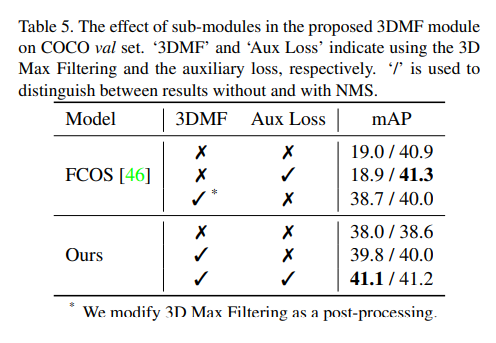 위의 또다른 ablation study의 결과를 보면 제안하는 모델에서 nms를 사용하지 않고 sub-module들이 모두 적용되었을때, FCOS베이스라인에서 Aux loss만 적용되고 nms를 사용하였을때와 0.2밖에 차이가 안납니다.