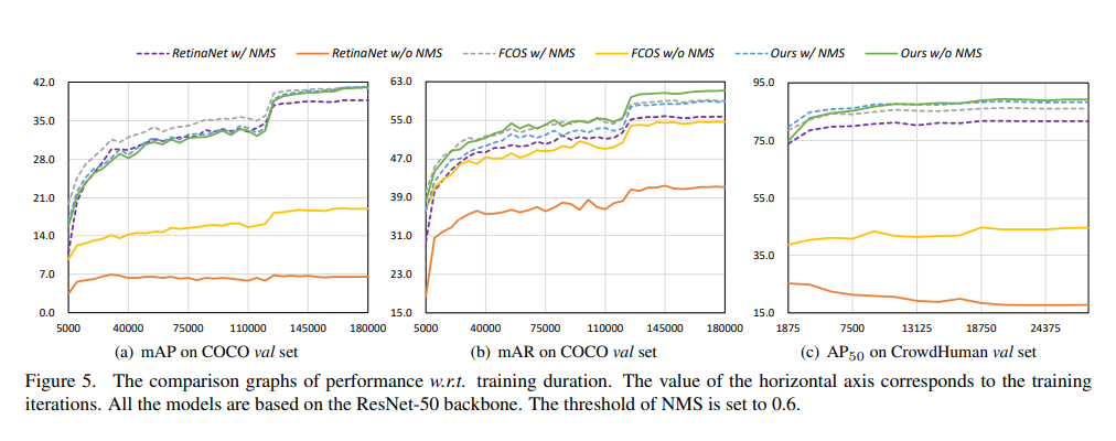 With these techniques, our end-to-end framework achieves competitive performance against many state-ofthe-art detectors with NMS on COCO and CrowdHuman datasets.