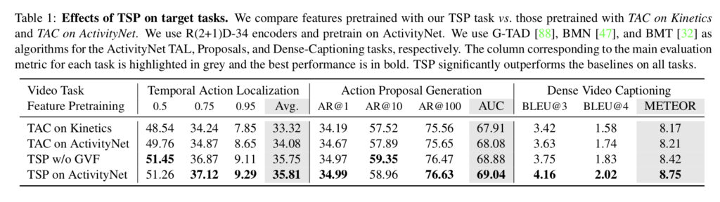 Temporal Action Localization , Action Proposal Generation , Dense Video Captioning에 대한 성능들이 나와있고 , 각 Task에 대해서는 TAC와 TSP 같의 성능 차이를 확인할 수 있습니다.