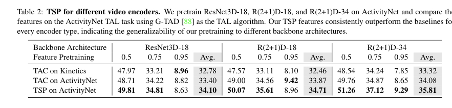Temporal Localization Task에 대한 벤치마크이며 , TAC와 TSP의 성능을 비교하고 있습니다. 모든 Video Encoder에서 TSP가 평균적으로 더 높은 성능을 보여주는 것을 확인할 수 있습니다.