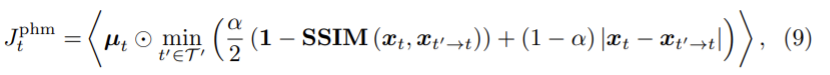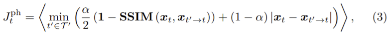 photometric loss Jtph를 구하기 위해 ɑ=0.85로 하고 per-pixel minimum photometric loss를 이용하여 다음 식을 얻었다.
