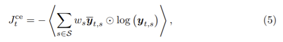 픽셀 xt,i에 할당된 라벨 mt,i는 입력 이미지와 출력 score yt∈IHxWxS 로 비선형 매핑된다. 각 픽셀의 인덱스는 i, 클래스는 s일 때 각 요소pt,i,s의 출력 score인 yt는 픽셀 xt,i가 이후에 s클래스에 속할 확률로 생각 할 수 있다. segmentation mask mt∈S는 mt,i = argmaxs∈S yt,i,s로 얻을 수 있고 모든 픽셀에 한 class를 할당할 수 있다. gt와 이후 이후 클래스 확률 사이의 cross-entropy loss를 이용하여 가중치를 부여해 학습한다. 마지막에 모든 픽셀의 평균화하고, loss 함수는 다음으로 정의된다.