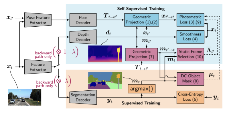 - 새로운 semantically-masked photometric loss를 이용해 움직이는 객체에 대한 해결책을 제시한다.