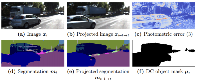 그림2의 (c)에서 확인할수 있듯 움직이는 DC객체는 photometric error를 오염시킨므로 움직이는 모든 DC 객체 뿐만 아니라 두 투영된 프레임으로 잘못 투영된 DC 객체들에 대해 마스킹하여 제외시키고 싶다. 따라서 투영된 semantic masks mt’→t는 다음 식으로 계산한다.