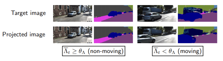 DC 객체를 완전 제외할 수 없으므로 객체들이 움직이지 않을 때만 학습한다. 따라서 DC 객체가 움직이는지 움직이지 않는 지 결정해야 하고 DC 객체가 움직이는 것으로 관찰될 경우 target 이미지 내의 semantic mask mt는 낮은 연관성을 가지므로 mt’→t와 mt의 동적 객체 class들의 합집합 분의 교집합을 측정한다.
