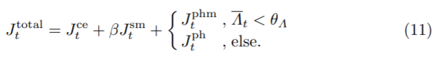 각 epoch 이후 마다 이미지가 정적인지 동적인지 측정하여 Λt 바를 계산하고 임계값 θΛ을 선택한다. 최종 loss는 식(9)와 (3), smoothness loss (4), cross-entropy loss(5)를 결합하여 다음과 같은 식으로 얻을 수 있다.