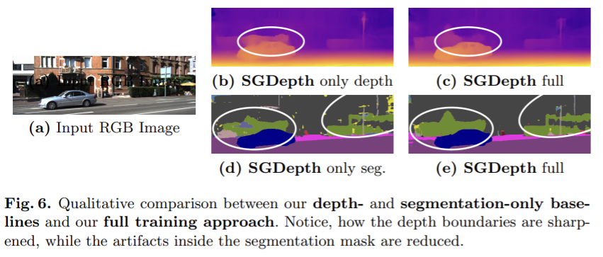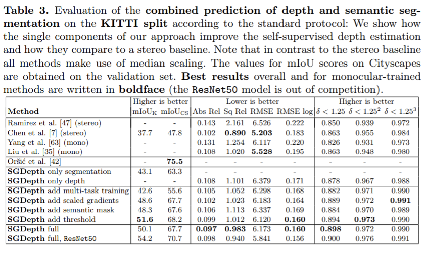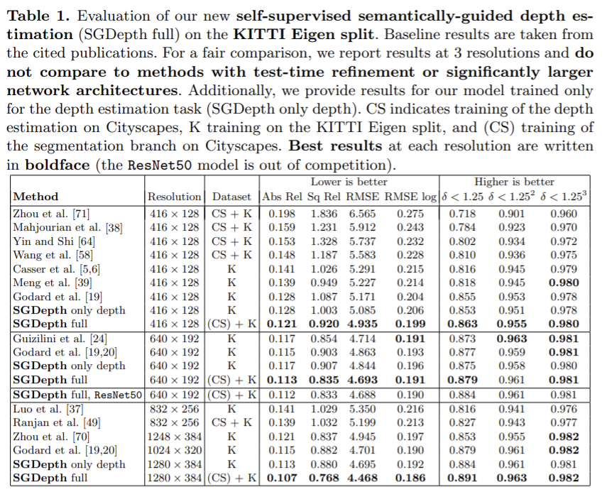 주요 평가는 Eigen split에서 수행되었다. 전체 SGDepth 접근 방법은 모든 baseling보다 좋다. 해상도가 높아질 수록 성능이 좋으므로 3가지 해상도에 대해 결과를 리포팅하였다. 또한 segmentation 없이 self-supervised depth estimation만 학습한 결과를 보았을 때 전체 SGDepth방식을 이용한 것이 성능이 좋다는 것을 보여준다.