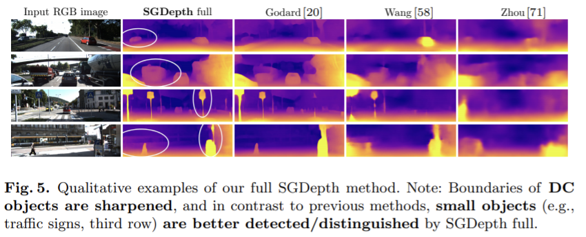 다음 정성적 평가를 통해 논문의 방식이 DC객체들의 depth를 분명한 모양으로 잘 추정한 것을 확인할 수 있다. 게다가 신호등 같은 작은 객체를 잘 찾는 것을 확인할 수 있다.