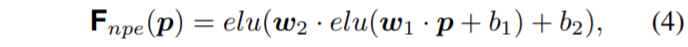 deep positional feature map \bold{F_{npe}}는 어떻게 만들까요? 저자는 pixel location(x, y)를 가지는 패치에 2개의 fc layer와 ELU activation을 거쳐서 만듭니다.