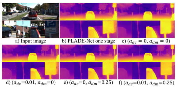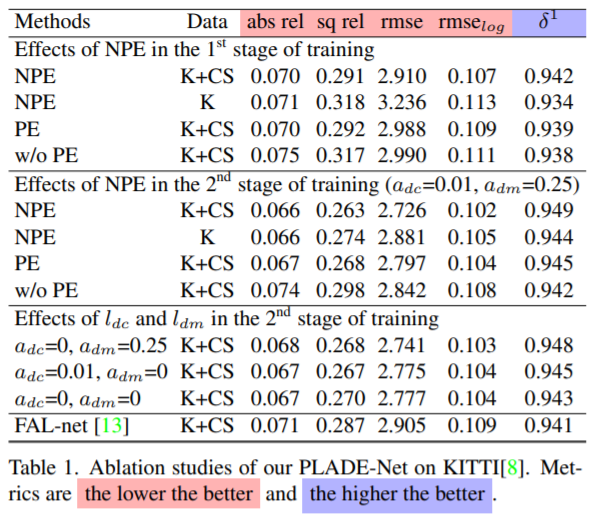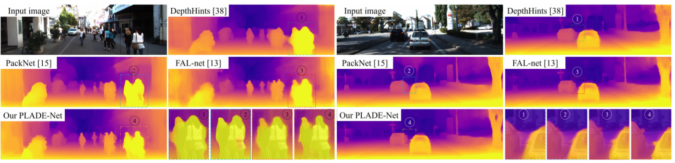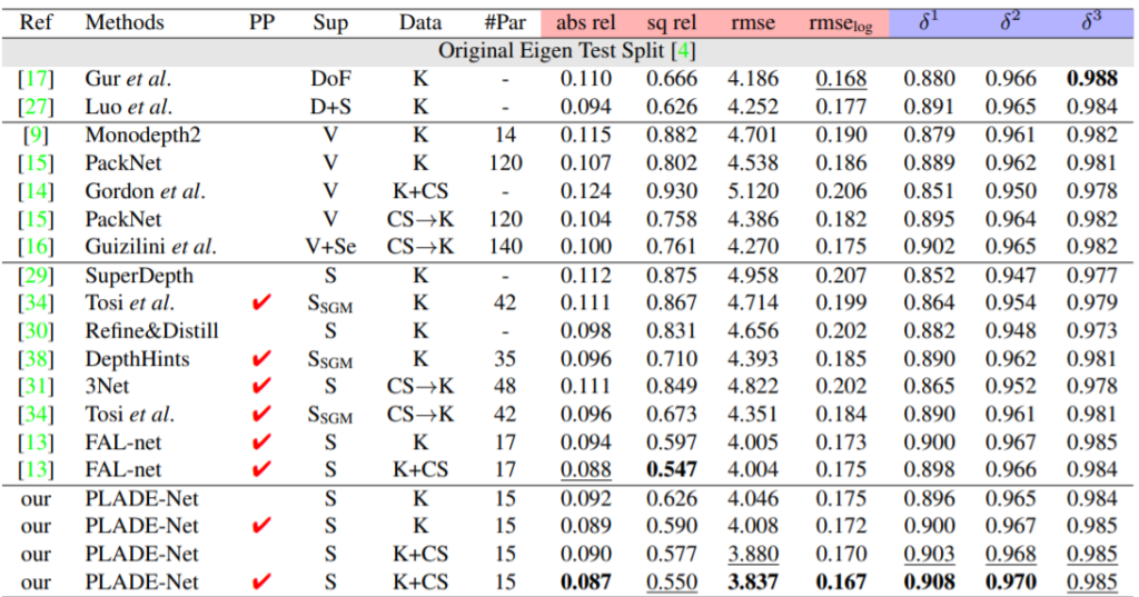 PackNet은 video 즉 앞, 뒤 인접한 프레임을 통해서 학습하는 방식이므로 사실 스테레오 기반의 방법론 대비 성능이 낮을 수 밖에 없습니다. 하지만 FAL-net, DepthHints 방법론들과 같이 stereo 방법론들과 비교하였을 때도 PLADE-Net이 모다 선명한 결과물들을 보여주고 있음을 확인할 수 있습니다.