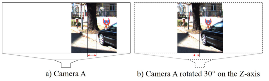 여기서 특히 lens와 projection 왜곡은 잘 아시다시피 영상 가장자리에 존재하는 물체들의 외형을 길쭉하게 늘려버리는 현상으로, 영상의 중앙에 가면 갈수록 잘 발생하지 않는 현상을 의미합니다. 이러한 현상은 만일 두 물체가 동일한 거리에 있음에도 불구하고, 단지 영상의 가장자리와 센터에 놓였다는 이유 만으로 다르게 투영될 수 있으며, 이러한 물체의 상대적인 크기는 깊이 추정을 학습하는데 큰 영향을 끼칠 수 있다고 합니다.