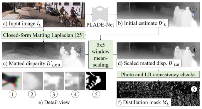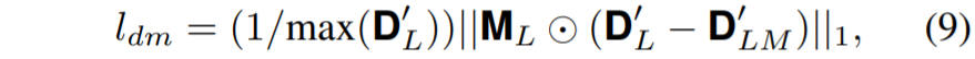 요약하자면, 저자는 네트워크를 통해서 생성하는 초기 disparity map이 locally scaled matted disparity map처럼 object의 경계면도 정확히 구분지어서 추정되도록 학습시키고 싶은 것이며, 이를 위해서 수식(5)와 같은 부등식을 통해 \bold{D'_{LM}}과 다른 픽셀들을 선별하는 distillation mask \bold{M_{L}}를 설계한 것입니다.