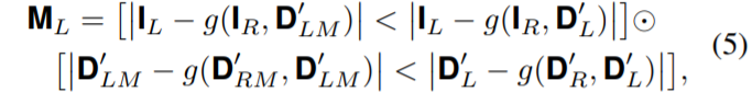 뭔가 복작복작해보이지만 별 내용 없습니다. g는 backward warping operation을 의미하며, \bold{D'_{R0}, D'_{RM}}은 각각 오른쪽 입력 영상에 대한 초기 disparity 값과 locally scaled matted disparity map(그림2-(d))을 의미합니다.