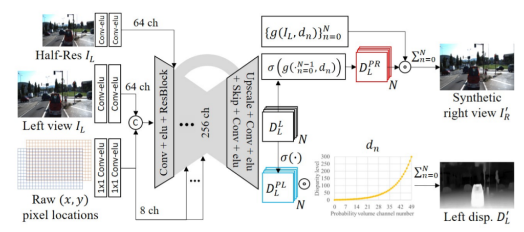 해당 방법론은 self-supervised 방법론들 중 Stereo Image를 통하여 학습하는 방식입니다. 즉 네트워크는 현재 frame에서 앞, 뒤 frame 영상을 만들기 위한 disparity(inverse depth)를 추정하는 것이 아니라, 좌-우 영상을 warping하기 위한 disparity map을 추정하도록 학습하는 것이죠.