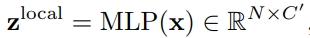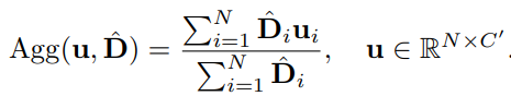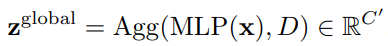 Prediction module에서는 앞선 backbone network에서 생성된 token feature x와 Decision mask를 입력으로 식 (1)과 같이 z^{local}, z^{global} 을 만들어 내게 됩니다. 식 (1)의 첫번째 식과 같이 크기가 NxC (token num of one image x dim)인 token feature x를 입력으로 각각 두어 MLP Layer에서 연산하여 크기가 NxC’인 z^{local}를 만듭니다. 여기서 C’은 C/2를 의미합니다. 이와 유사하게 global feature인 z^{global} 를 연산하기위해 Decision mask에서 1로 나타난 위치들의 평균을 내주는 Agg 함수로 average pooling을 취합니다.