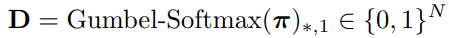 첫번째로는 \pi로부터 Decision mask D를 생성하는 과정을 미분가능하도록 설계하고자 식(4)와 같이 Gumbel Softmax 연산을 적용하였습니다. Gumbel Softmax는 Softmax가 미분가능하도록 근사한 방법입니다.