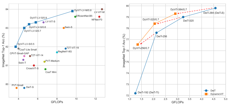 [Right] Comparison of our dynamic token sparsification method with model width scaling.