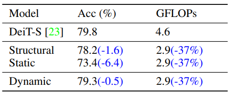 마지막으로 Table 2는 base backbone network로 사용되었던 DeiT-S에 제안된 attention mask을 사용했을 때(Dynamic)와 기존 CNN에서 사용되던 Pooling 방식을 사용했을 때의 정확도 및 GFLOPs를 비교한 표입니다. 제안된 방식이 GFLOPs 면에서는 기존 방법론과 비슷한 수준을 보이나 정확도 면에서 볼 때 기존에는 성능 하락이 심했던 반면 제안된 방식은 baseline과 비슷한 성능을 보였습니다.