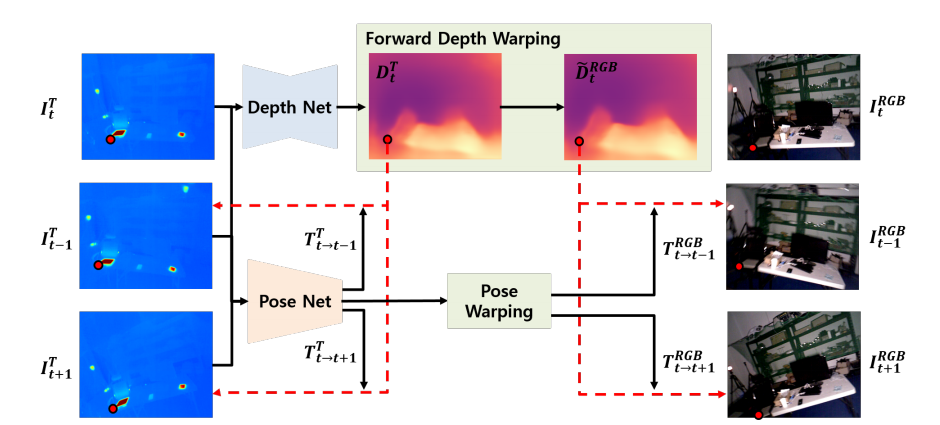 RGB 정보를 Depth Network에 전달하기 위해서 이 논문에서는 생성된 Depth Map과 Pose를 이용해서 target thermal와 pair를 이루는 target RGB를 Source RGB로 Recontruction 합니다. 이때 구한 Pose와 Depth는 Thermal 카메라 기준이기 때문에 RGB 카메라과 Thermal 카메라가 촬영된 Pose가 달라서 기존의 추가적인 모듈이 필요합니다.