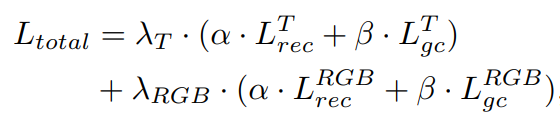 학습을 위한 Total Loss는 다음과 같다. Lrec는 각 도메인이 Recontruction 된 것을 가지고 Loss를 구사는 것이고 Lgc는 e뒤에서 설명하겠습니다. 위 식과 같이 Thermal 와 RGB 의 재복원 영상을 이용해 학습을 합니다.