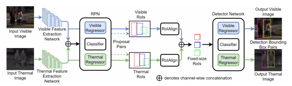 사실 논문이 간단한 내용이라 크게 설명드릴점은 없지만, 기존의 Faster RCNN 기반 방법론들이 fused feature map에서 단일 ROI를 추출하였다면, 해당 논문은 두 모달리티에 독립적인 ROI를 추출하여 마지막까지 박스를 예측하는 방법론 입니다. 위에 그림에서 확인할 수 있듯 해당 논문은 두 모달리티에 대해 box Regressor를 독립적으로 보유하는 네트워크를 제안합니다. 최종적인 아키텍처는 아래 그림과 같습니다.