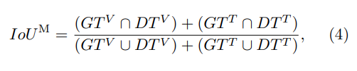 GT와 DT의 notation은 동일하며, V,T,M이 추가됐는데 각각 V:visible(rgb) , T:Thermal, M: Multimodal 입니다. 즉 기존에는 단일 모달리티에만 사용했던 IoU 계산 방식을 각각 모달리티에 대해서 IoU를 계산하도록 평가방식을 제안합니다.