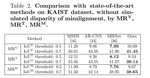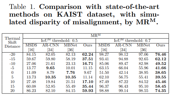 가장 먼저 논문의 제목처럼 Thermal 이미지를 shift하여서 이에 따른 Miss-rate를 평가합니다. 이때 IoU는 본인들이 제안한 방식으로 평가하였고, 그 때 결과는 위의 표와 같습니다. 일반적인 범주에서는 기존 모델들이 더 좋은 성능을 나타냈지만, misalignment가 커진경우 자신들의 방법이 더 강인함을 이야기합니다.. 또한 특히 IoU thres를 0.7로 하였을때는 자신들의 성능이 가장 좋다고 이야기합니다….