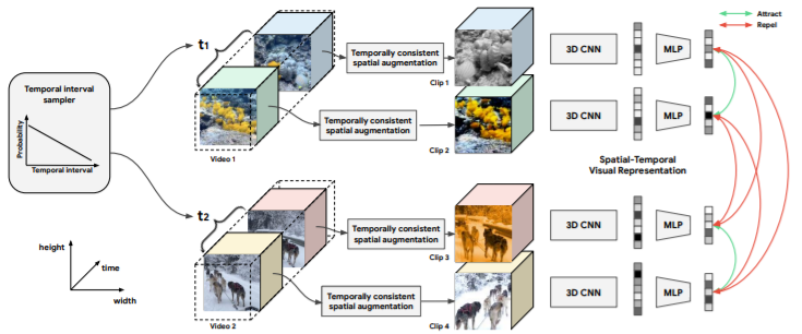 해당 논문은 spatio, temporal 정보를 이용한 video augmentation을 통해 contrastive learning을 진행한는 방식을 소개한 논문이다.