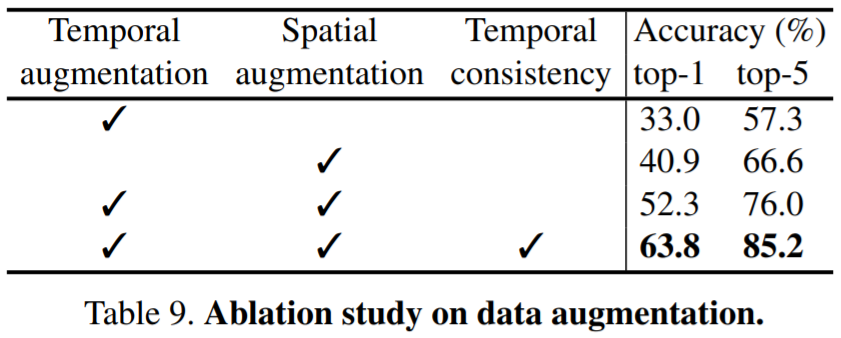 성능 향상폭이 큰 ablation study의 경우 1,2행의 경우 temporal 혹은 spatial augmentation을 아예 적용하지 않은 경우로, 각각을 비교하기 보다 3행과 4행의 성능 향상폭(top1:11.5)이 더 의미있다고 생각했습니다!