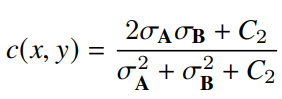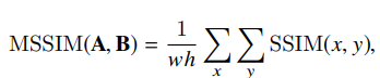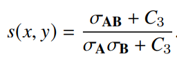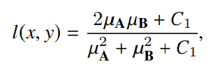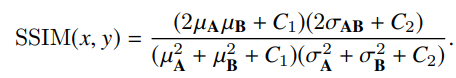 이 논문에서는 먼저 SSIM이 수식적으로 어떻게 작동하는지 알려줍니다. A와 B이미지의 SSIM을 계산할 경우 식은 다음과 같습니다.