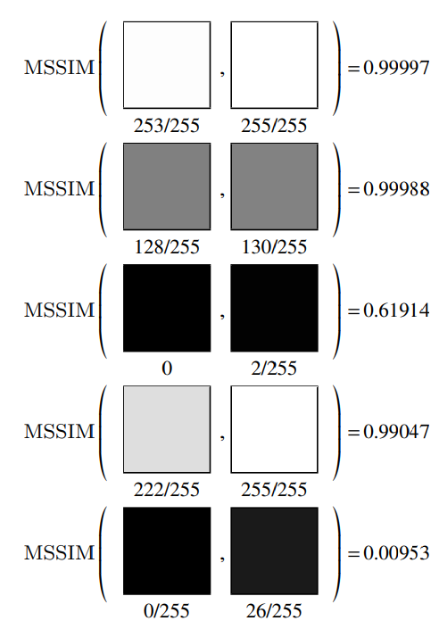 SSIM 속 Luminance는 두 영상의 값 Luminance를 평가하는 것으로 동일한 값차이 날경우 동일한 평가 값이 나와야하는 것이 직관적인 해석입니다. 하지만 이 논문에서 분석하길 명도값이 높을 경우와 낮을 경우에 따라서 평가 값이 다르다고 합니다. 아래 분석 결과들과 함께보면,