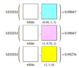 색깔의 문제는 luminance의 문제와 동일합니다. 명도가 높을 경우 눈으로 봐도 다른 색깔을 SSIM으로는 오차로 판단하지 못한다는 것입니다.