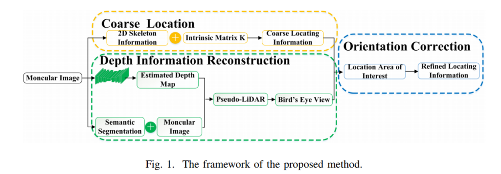 해당 방법론은 fig 1.과 같이 3가지 파트로 구성되어집니다. monoloco를 통한 coarse한 위치 정보를 예측하고, pseudo-lidar와 semnantic segmantation을 이용하여 dense한 정보를 추론합니다. 그후 coarse한 위치 정보와 dense한 위치 정보를 토대로 위치 정보를 보정하여 예측합니다.