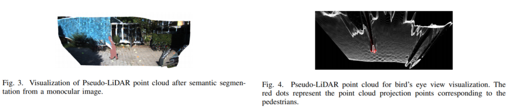(2) Depth Information Reconstruction. 단안 영상을 입력으로 사용하는 mono depth estimation 모델을 통해 depth를 예측하고 semantic segmentation 모델을 통해 보행자를 예측하여 해당 하는 컬러 정보를 depth에 추가한 후, pseudo-lidar로 변형 후, BEV로 사영시킵니다. 보행자의 semantic 정보가 컬러 정보로 pseudo-lidar에 적용된 모습은 fig 3.을 통해 확인 가능하며, BEV에 적용된 모습은 fig 4.를 통해 확인이 가능합니다. depth estimation과 semnatic segmentation은 각각 [3], [4]의 방법론을 적용하여 추론하였습니다.