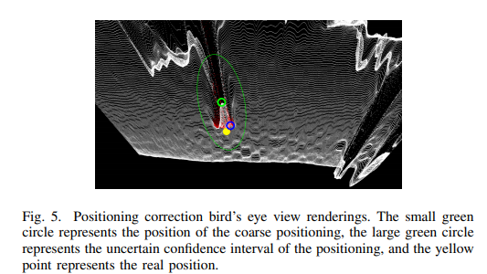 B. Mean-Shift clustering location Correction method: 컨볼루션 커널로부터 획득한 정보들로 보행자의 시맨틱 세그멘테이션에 해당하는 위치 정보들을 획득하게 됩니다. 이 정보들을 Mean-Shift clustering을 통해 보정된 위치 정보를 습득합니다. 그렇게 얻은 정보들은 Fig 5에서 확인할 수 있습니다. coarse한 위치 정보는 작은 초록색 원에 해당하며, 불확실성 bias는 초록색 큰 타원에 해당합니다. 보정을 통해 최종적으로 예측된 위치는 파란색에 해당하며, GT는 노란색 원에 해당합니다.