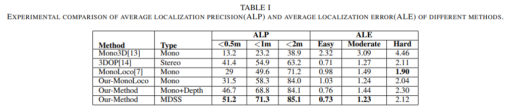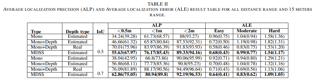 Table 1을 통해 기존의 방법론보다 성능이 개선된 모습을 볼 수 있습니다. 하지만 ALE-Hard에서 비교적 낮은 성능을 보이는데, 먼거리에 위치한 깊이 정보가 비정확하고, 2d bbox가 비정확함으로써 발생한 현상이라고 주장합니다. 또한 Type의 MDSS는 Mono+Depth+Semantic Segmentation의 약자에 해당합니다.