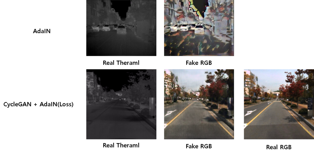 위의 그림과 같이 ‘RGB 또는 Thermal의 컨텐츠를 살리고 다른 모달리티 이미지의 스타일만 가져오는 새로운 이미지를 만들어 alignm이 맞는 두 이미지의 fusion을 통한 detection을 수행하면 어떨까’ 라는 생각을 하게 됐습니다. 그래서 이를 간단히 적용해보기 위해서 가장 대표적인 AdaIN과 CycleGAN에 AdaIN로스를 추가하여 결과를 확인해봤습니다.