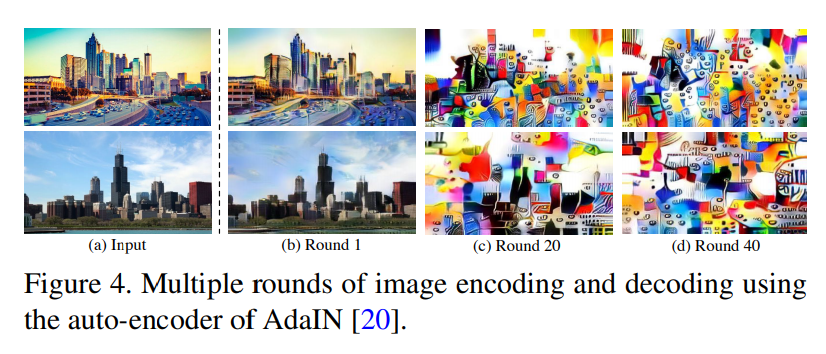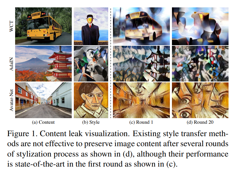 또 다른 종류의 Content Leak 발생 요인으로 Avatar-Net에서 사용하는 Style Decorator(style transfer module)에 대해서 이야기합니다. 해당 방법론은 content feature(f_c)와 style feature(f_s)를 normalize하는데, 방법은 먼저 f_s에서 f_c에 알맞는 corresponding patch를 찾아서 Style Decorator라는 모듈을 통해 만든 f_cs로 대체한다는데, 문제는 f_cs를 이용해서 f_c를 온전히 만들수는 없다고 합니다. 그리고 이러한 문제가 Content Leak을 발생시킨다고 합니다. (이 부분은 Avatar-Net에 대해서 좀 더 알아봐야할 것 같습니다.)