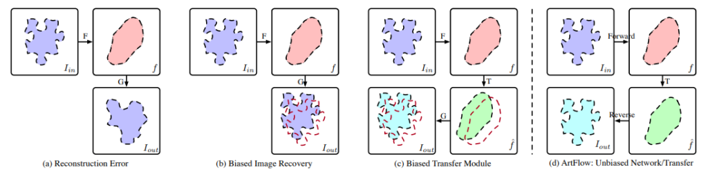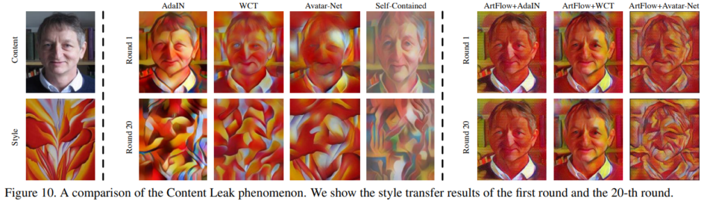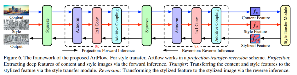 이러한 문제들로 인해서 Content Leak은 발생하며 저자는 이러한 문제를 해결하기 위한 reversible neural flow model인 Projection Flow Network(FPN)을 포함하는 ArtFlow라는 방법을 제안합니다.