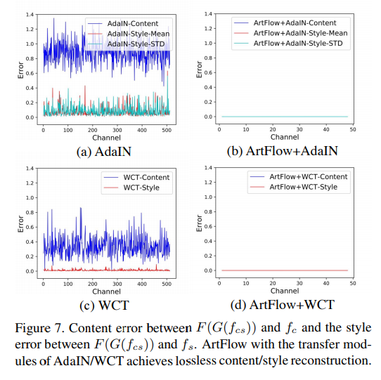 또한 Content Leak 문제를 해결하기 위해서 Content Leak의 발생요인으로 Style과 Content를 동시에 학습하면서 biased 되는 문제를 앞서 설명했는데요. 저자는 lossless feature projector/inverter로 FPN을 사용하면 해결될 수 있다고 합니다. (이에 대해서 몇가지 가정과 증명을 다루고 있는데 이는 생략하겠습니다.) 그리고 FPN을 projector/inverter로 기존에 제안된 AdaIN, WCT에 적용하면 다음과 같은 error 그래프를 볼 수 있다고 합니다.