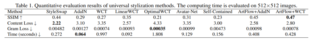 SSIM, Content Loss, Gram Loss 등을 통해서 정량적으로 비교하였는데, SSIM을 통해서 자신의 방법론이 가장 높은 스코어를 나타냈다고 합니다. 속도적인 측면도 설명하고 있는데 자신들의 방법은 pooling이 없어 큰 이미지를 다루고 있기 때문에 다소 느린 속도가 나타남을 언급하고 있습니다. 또한 gram loss 같은게 가장 낮지 않았는데, 이는 해당 gram loss를 타겟으로 학습하지 않았기 때문에 reasonable 하다고 합니다. (아마 다른 논문에서는 Gram loss를 타겟으로 했다봅니다.)