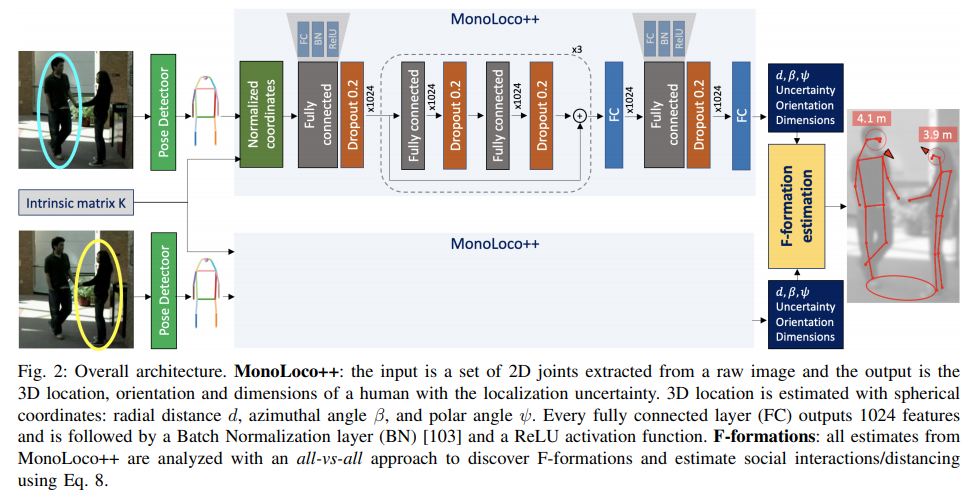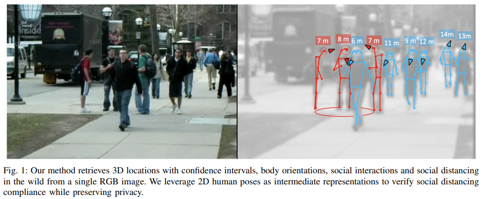 이번 리뷰 논문은 monoloco ~ MonStereo의 중간 단계에 해당하는 논문에 해당합니다. 단안 영상에서 추정된 보행자의 포즈 정보를 이용하여 3차원 위치 정보를 추론하는 monoloco에서 보행자의 방향 정보를 추가로 추론합니다. 또한 저자는 해당 논문을 식에 맞게 코로나 거리두기와 연관둔 기능을 추가로 소개합니다. 이전 연구에서 사람들간 소통에 대해 분석한 F-formation을 이용하여 보행자간 거리와 소통 여부에 판단하는 모듈을 추가합니다. (참고 fig 1)