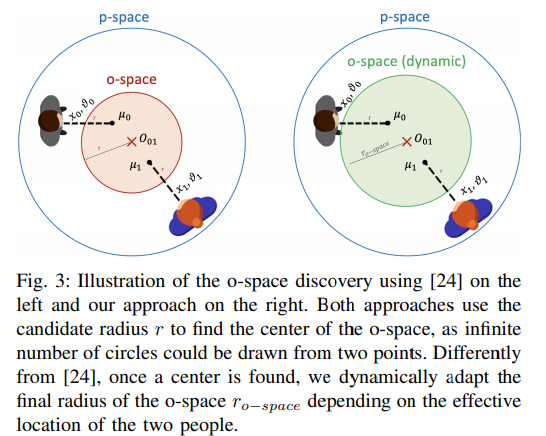 6. F-formation estimation. 모든 보행자들로부터 추론된 정보들을 all-vs-all 방법을 통해, 사회적 상호작용과 거리 정보를 예측합니다. 사회적 상호작용 및 거리는 규칙 기반의 알고리즘으로 작동합니다. 저자는 해당 영역에 추가적으로 o-space를 동적으로 적용하는 알고리즘을 제안합니다(fig 3.)