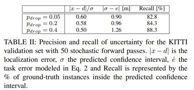 해당 실험에서는 drop out에 비율에 대한 ablation study에 해당합니다. 결과를 보면 drop out에 대한 비율은 불확실성과 에러에 대해 비례하고 Recall에 대해서는 반비례하는 trade-off 관계인 걸 확인 할 수 있습니다. drop out에 대한 비율이 커질 수록 불확실성이 커진 정보들만 가져가게 되고, 이는 먼거리에 위치한 보행자 혹은 가려진 보행자들도 후보에 추가한다는 이야기입니다. 이러한 케이스가 필요한 경우가 있습니다. 아래의 그림(fig 9) 같은 상황에 해당합니다.