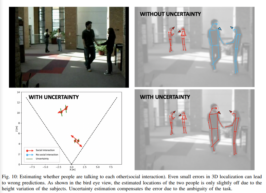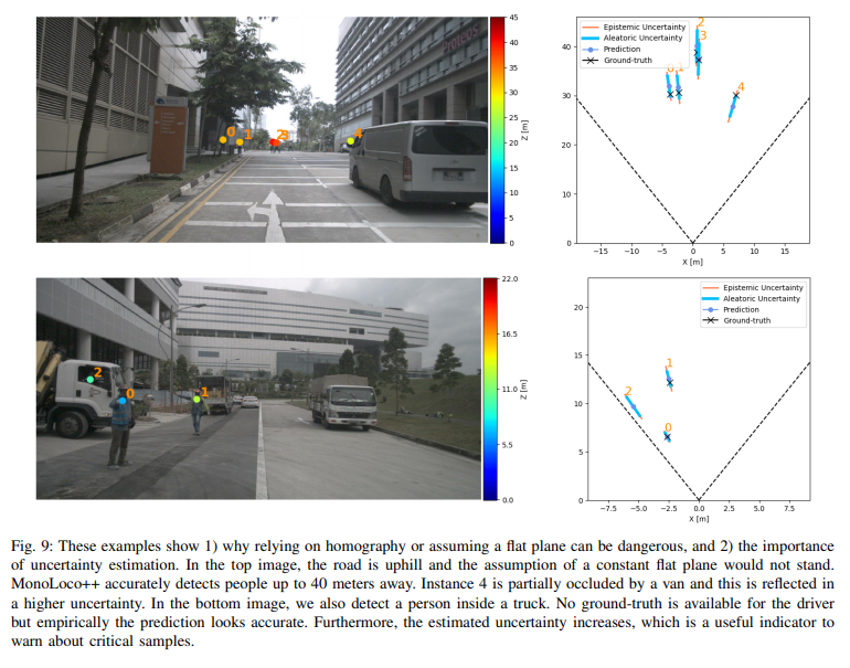 Fig 9의 상단의 4번 보행자와 같이 밴에 가려진 상황도 검출이 가능해집니다. 하지만 불확실성이 커진 것을 확인이 가능합니다. 추가로 하단 2번 보행자는 실제 GT에는 없는 상황에 해당합니다. 하지만 이런 비정상적인 상황에서도 예측함으로써 위험하거나 돌발상황에 대비할 수 있다고 이야기합니다.