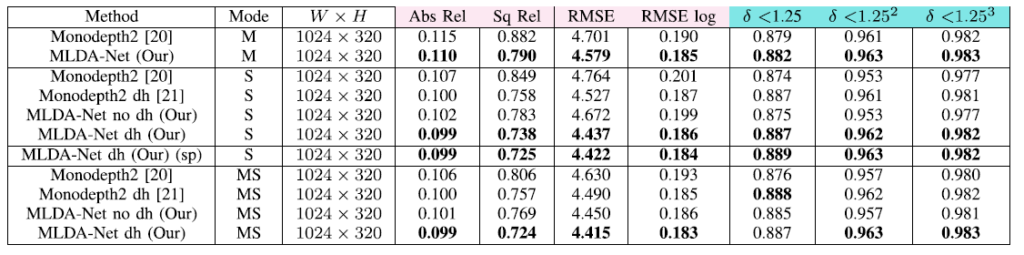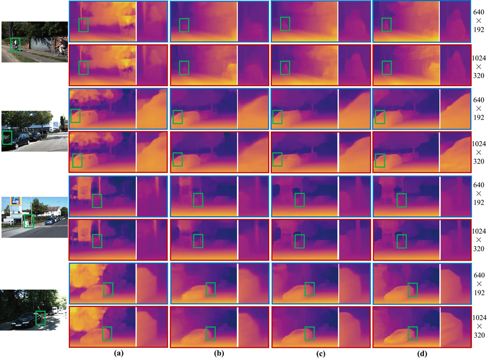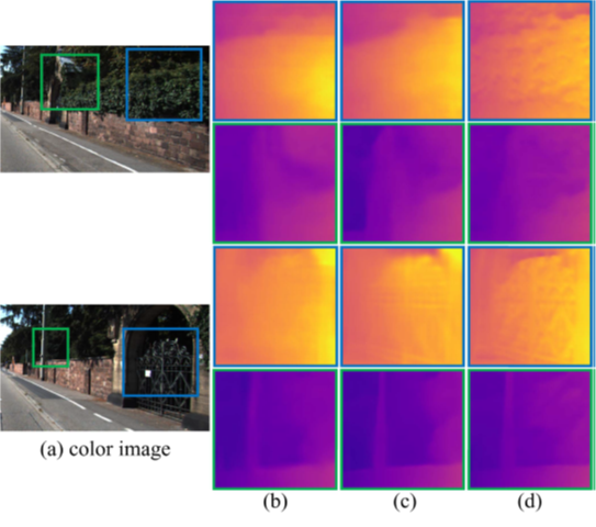 그림 1 (b) Mondpeth2 ,(c) Monodepth2 dh, (d) MLDA)