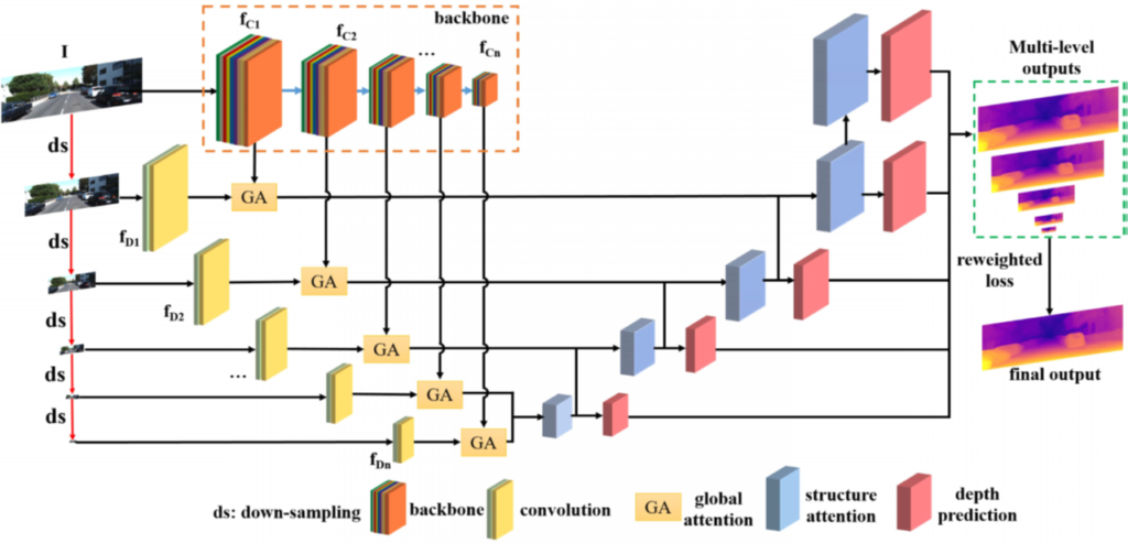 • 다양한 스케일의 영상을 입력으로 받아서 사용하는 Multi Level Feature Fusion(MLFE) 모듈을 통해서 고품질의 깊이 영상을 제작한다.