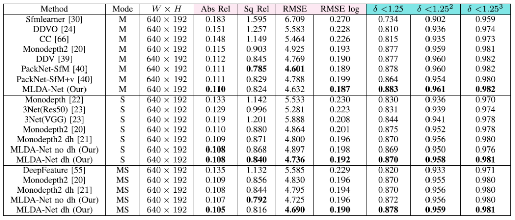 KITTI에서의 성능 평가 입니다 . Resnet18을 backbone으로 사용하는 모델들을 비교했다고 합니다. 큰 폭의 성능향상이 아닌 것 같아서 살짝 아쉽긴 하지만 그래도 좋은 성능을 보이고 있습니ㅏㄷ.